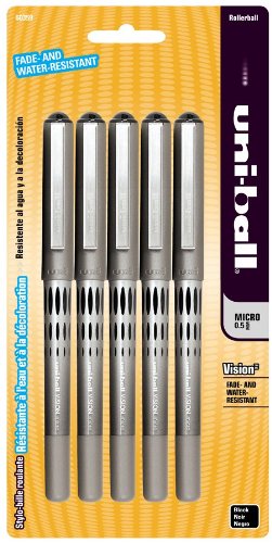 excellent writing implement - consistent, long lasting, September 24, 2010 By Amazon Verified Purchase This review is from: uni-ball Vision Stick Micro Point Roller Ball Pens, 5 Black Ink Pens (60359PP) (Office Product) ok, I used to get these free from work, where I insisted that they order them as part of my compensation package. What can I say, I am finicky, and when you are writing all the time who wants to push a cheapo stick pen when you can glide with rollerball flourish? I have tried various makes and models and always come back to the uniball micro. Note that even tho the product pic is of the old "diamond" barrel model, the actual product is the new "long oval window" barrel. Good price compared to retail office supply store.