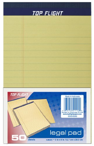 Great for the Price, June 29, 2011 By Schmitty (USA) - See all my reviews Amazon Verified Purchase This review is from: Top Flight Legal Pad, 5 x 8 Inches, .375 Inch Rule, Canary, 50 Sheets per Pad (4620614) (Office Product) I originally purchased these legal pads for two reasons. One: To pay a few cents extra on my order so that I could have super saver shipping, and two so that I could have something to write on in my briefcase that was easy to access.