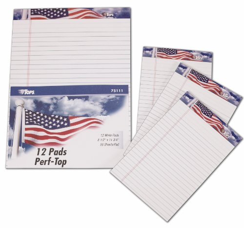 great note pad, November 10, 2011 By kitty central "Jean" (Tri-Cities WA) - See all my reviews Amazon Verified Purchase This review is from: TOPS American Pride Writing Tablet, 8 x 5 Inch, US Flag Headtape, 50 Sheets, 3-Pack, White (75103) (Office Product) loved the american flag on it while i was working - very nice paper and nice size. would love to have as a stocking stuffer for x-mas.